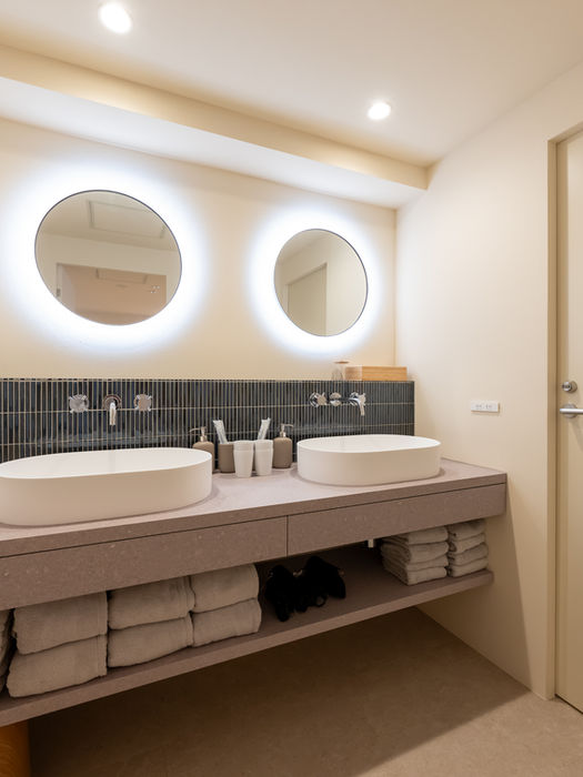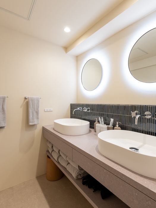 This spacious, bright, and inviting space features four double beds. Enjoy a restful night's sleep in this tranquil bedroom with modern Japanese-style wall art and indirect lighting. All beds are equipped with individual lighting and charging ports (USB/Type-C).